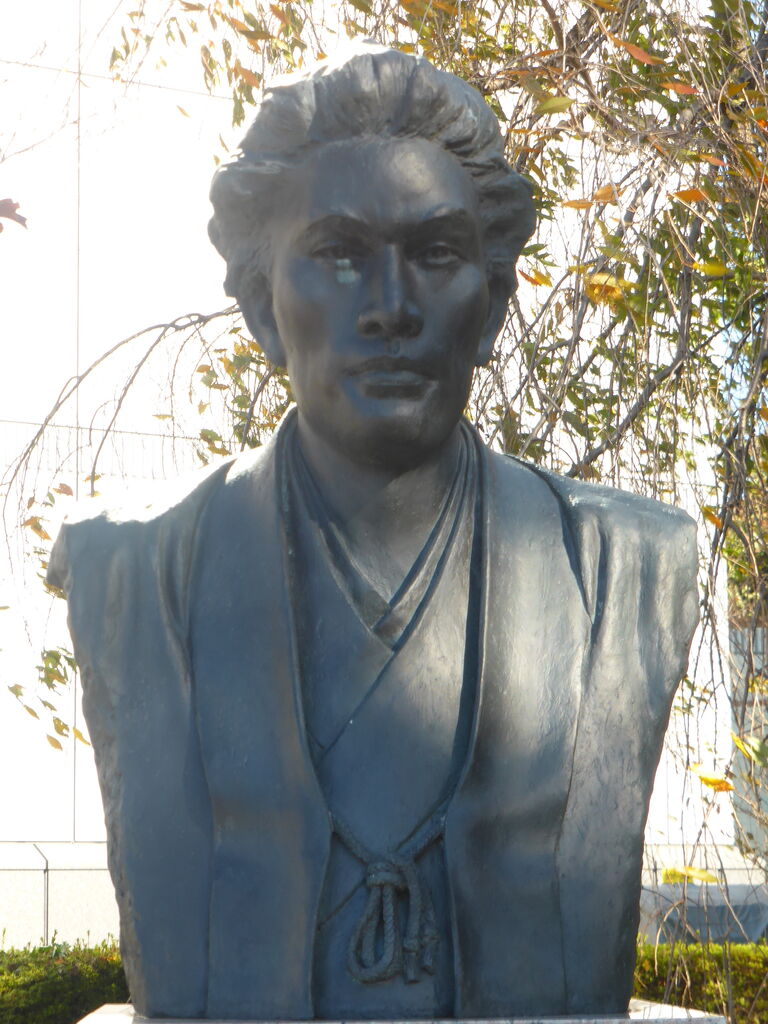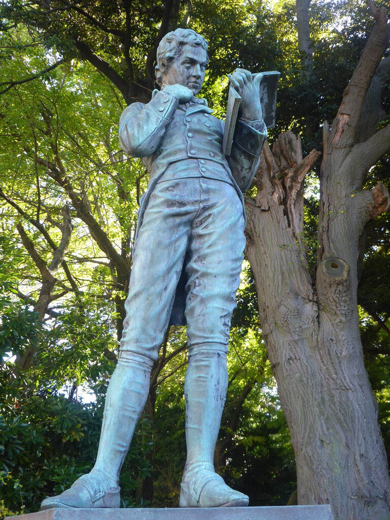 種痘(しゅとう:天然痘の予防接種)を発明したイギリス人の医師・ジェンナーの像。彫刻家の高村光雲(たかむらこううん)の弟子・米原雲海(よねはらうんかい)の作。台座にはめ込まれた碑文には、漢字で「善那」と書かれています。