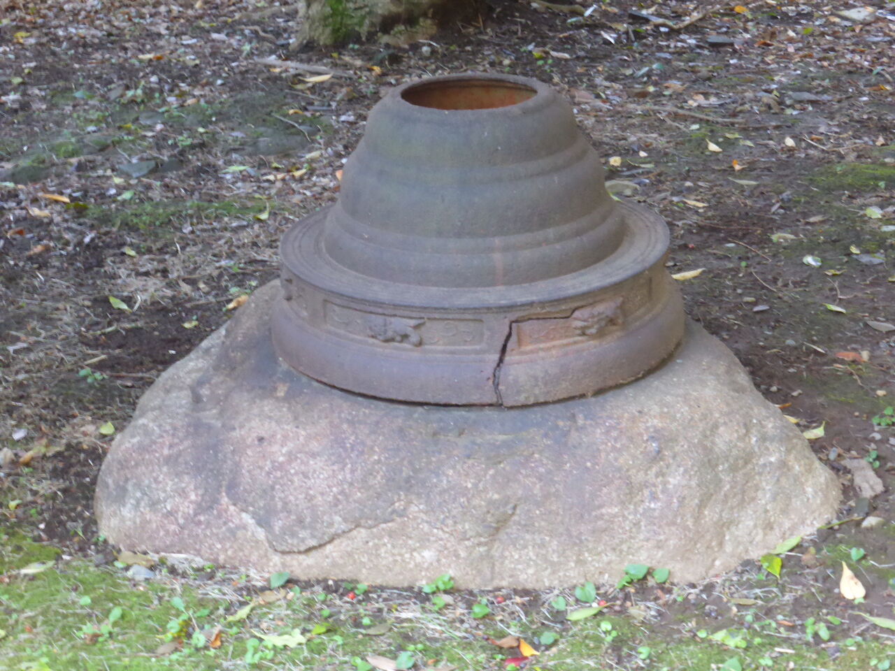 茶の湯釜師として有名な江戸名越家の六代目・名越建福(なごしけんぷく)作と伝わる。台風で倒壊後、基壇以外は別に保管しています。