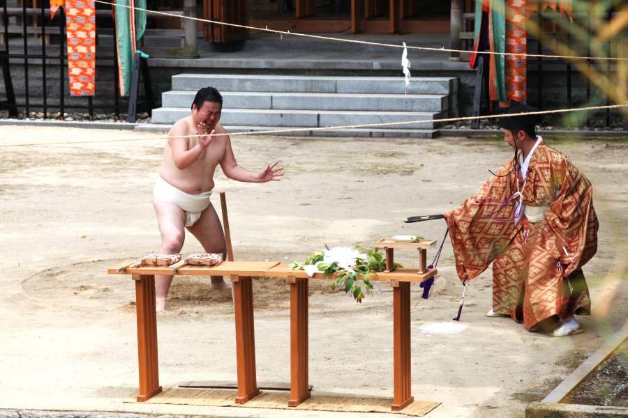 古来より続く伝統の祭。力の入った一人角力に観衆が沸く