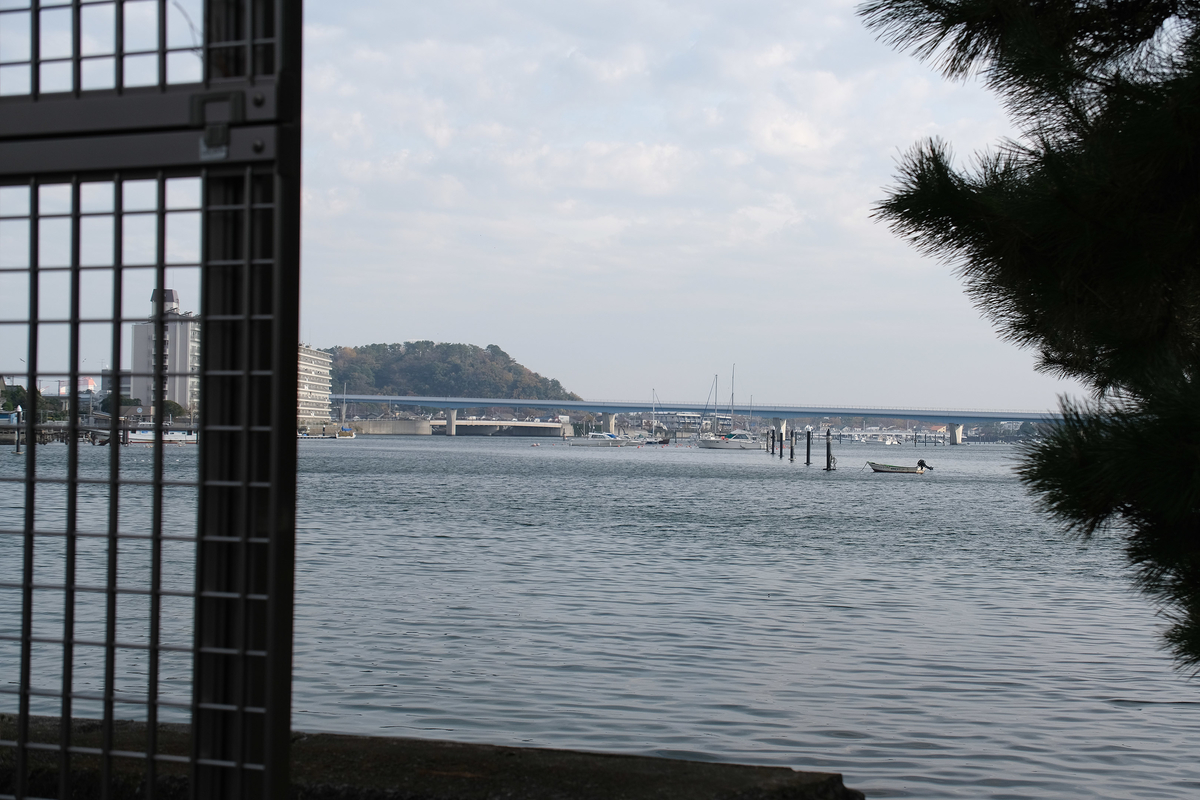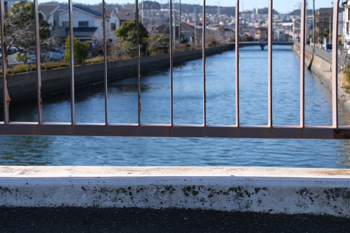 八景橋を渡り終わり、右折して川沿いを歩く二人。アングルはもう少し遠くからの望遠っぽいんだけど、遠くなると海を写すのが難しくなるので痛し痒し。
