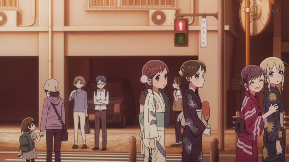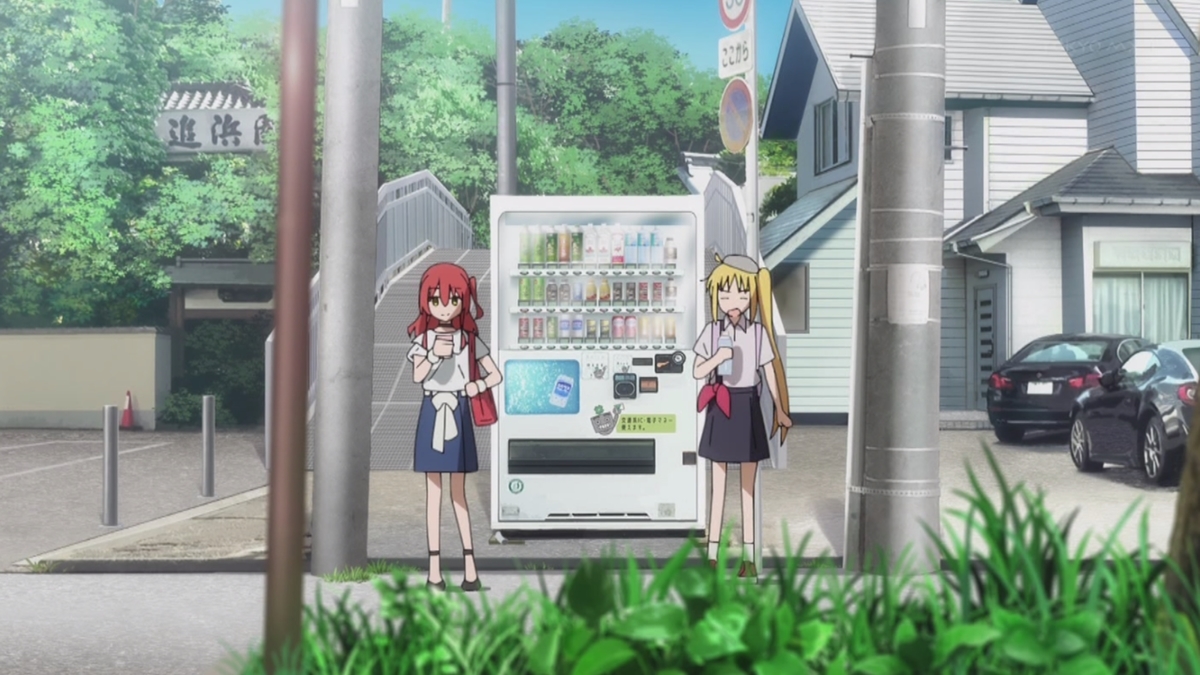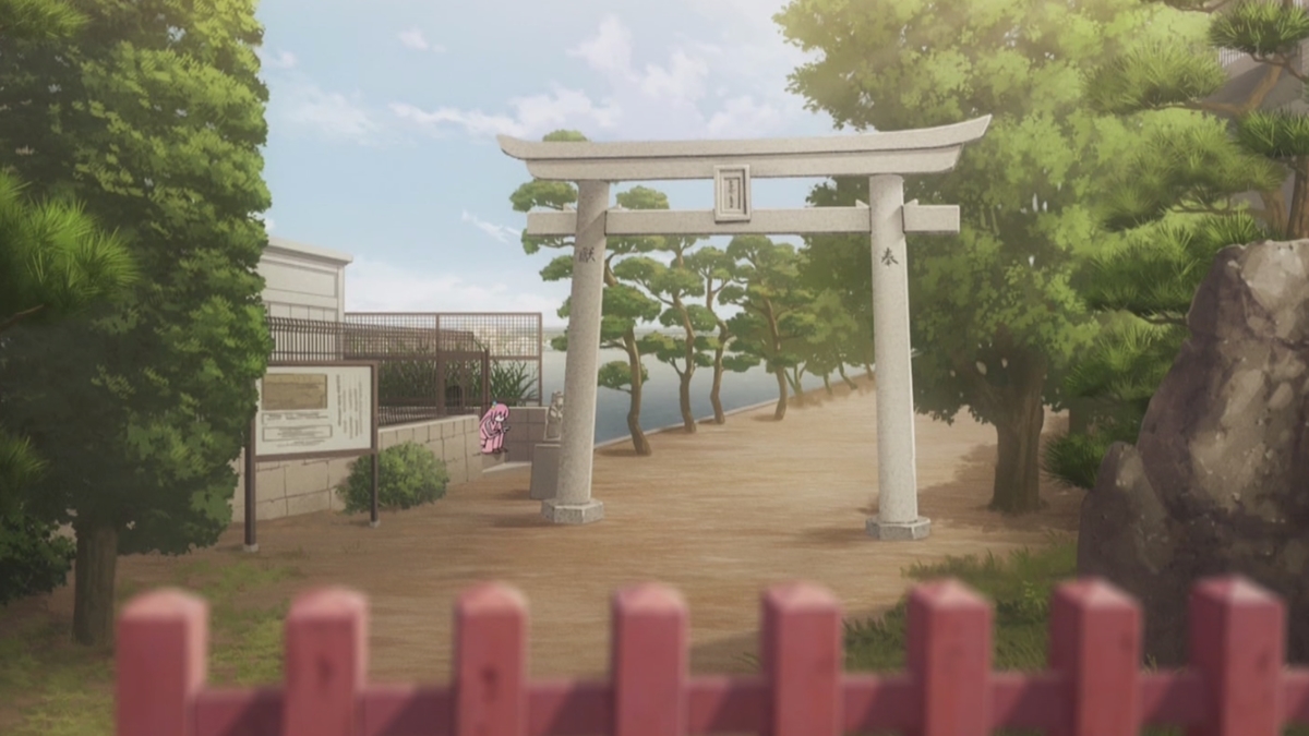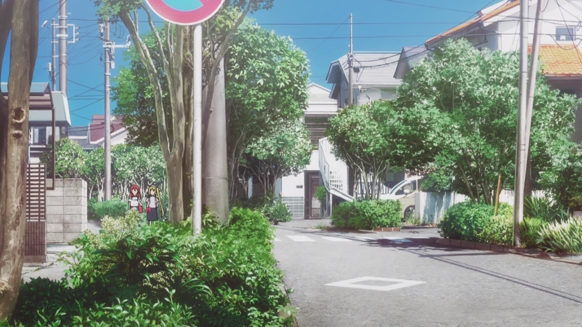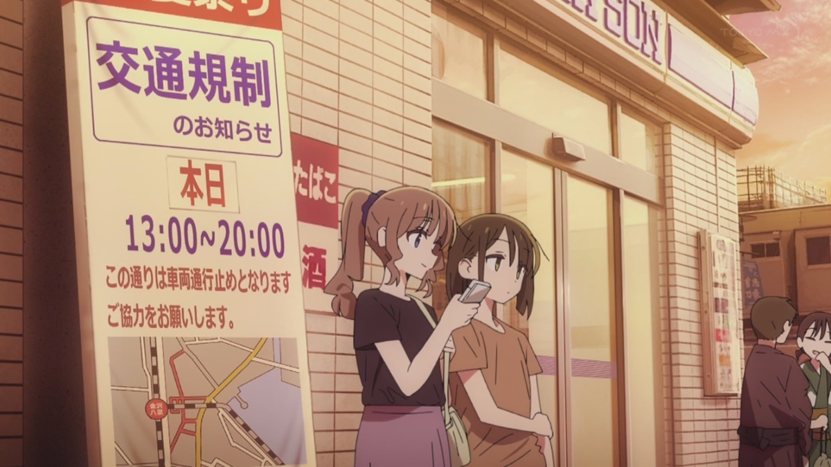 最初のシーンは実は第6話で路上ライブやったところのすぐ向かい。ただし、後ろの駐車場のスロープが無くなったためだいぶ雰囲気が変わっている。また自販機はない。ちなみにこの付近はなぜか旅館がいくつかあるようだ。右の白い建物も民家のように見えるが旅館である。