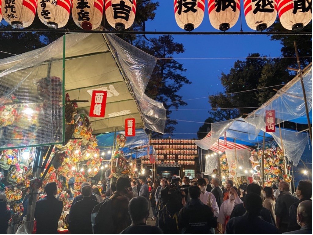 市では農具・古着・農作物・餅などが売られる農村的な祭りでしたが、農具の熊手が「福を掻き込む」と考えられてか、もっぱら水商売の人が買い求め、次第に農民以外に人気を博して都会的な祭りとなっていったそうです。