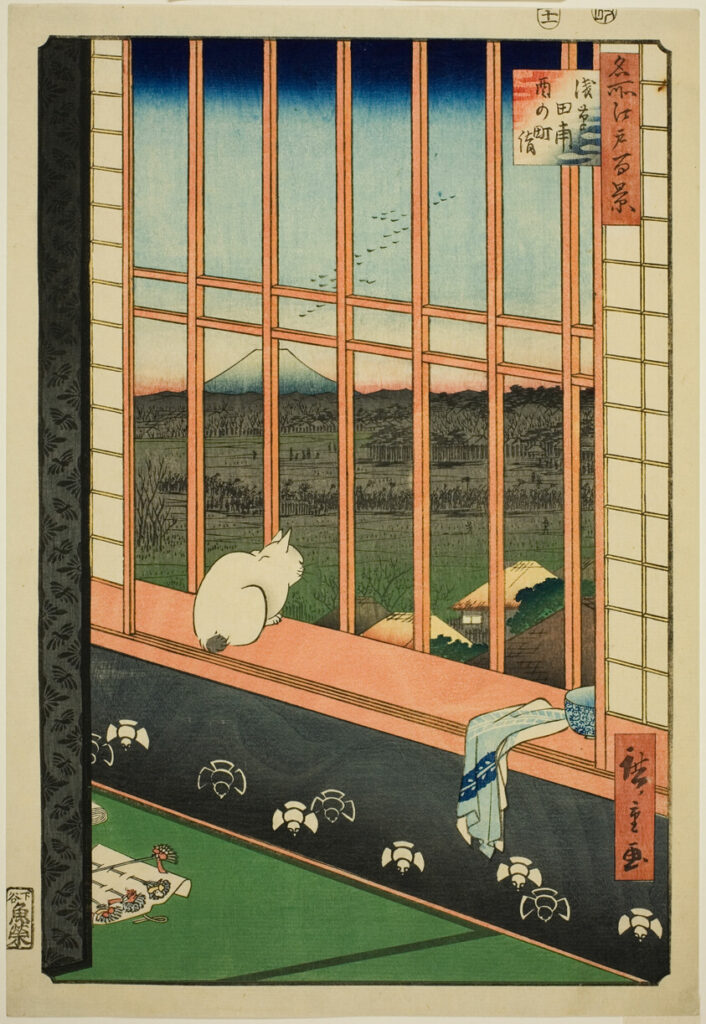 東隣に新吉原をひかえていたこともあり、鷲妙見大菩薩が千葉の大本山鷲山寺から長國寺に迎え移された明和8年(1771年)頃から、一躍「酉の町」として知られるようになりました。長國寺は浅草田圃(たんぼ)の酉の寺と呼ばれるようになって、江戸随一になった賑わいを猫が窓越しに見ている様子が、浮世絵「名所江戸百景」の一枚にも描かれています。